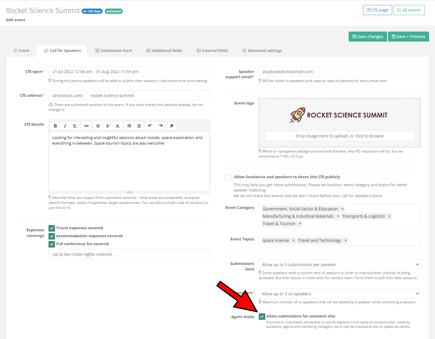 If you're an event organizer and would like to make it possible for people to submit sessions as someone else, look for the Agent mode toggle on the Edit event page. Tick the Allow submissions for someone else box and click Save changes at the top of the page.