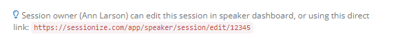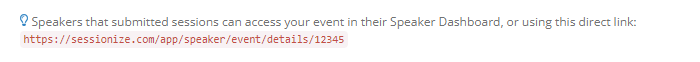 Sessionize creates two links that speakers can use to quickly access your event and their session(s):