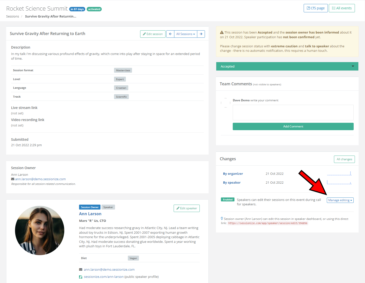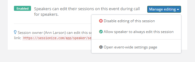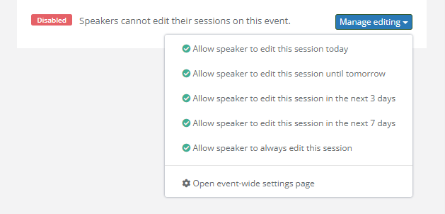 If, for any reason, you want to allow individual speakers to edit their sessions, you can override the global session editing settings on the Sessions page. Click on the name of the desired session to open it, and look for the Manage editing menu on the right side of the page.