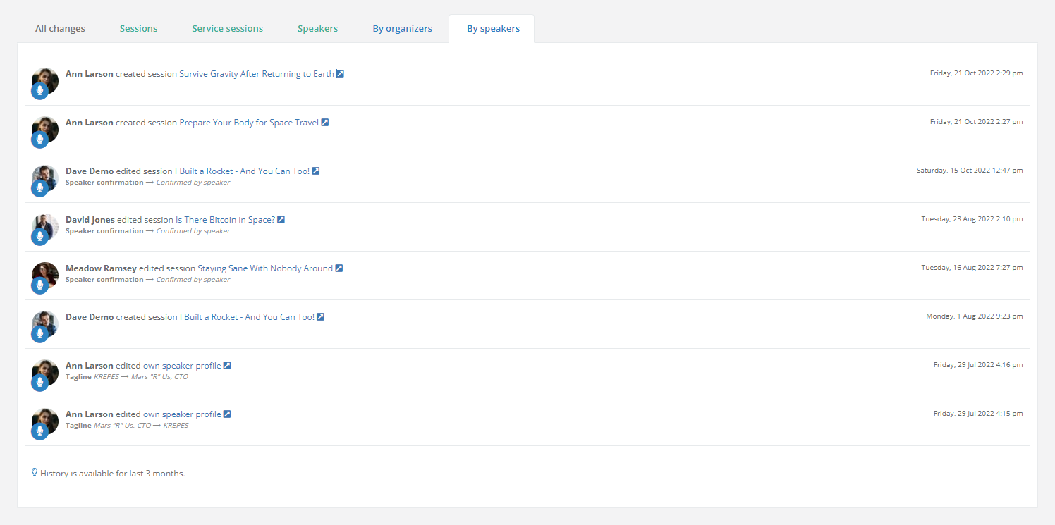 The History page allows you to keep track of any changes done to your event. That includes changes your speakers did to their sessions, which you can filter by switching to the By speakers tab.