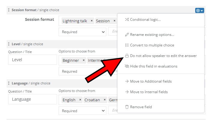If you want to let a speaker edit their session but don't want them to change one or more custom fields, you can lock such fields to prevent editing.