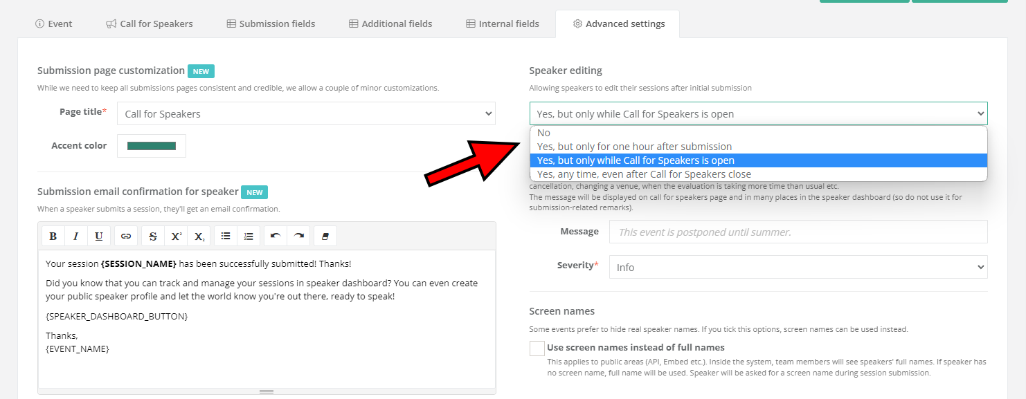 Your choice is applied globally, to all sessions, regardless if they've been submitted through your event's Call for Speakers page or added manually.