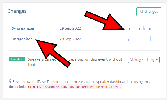 You can also access the session's history while viewing the session. Here you'll see a small visual aid that gives you an idea of changes done by the organizer and speaker across two accompanying timelines.