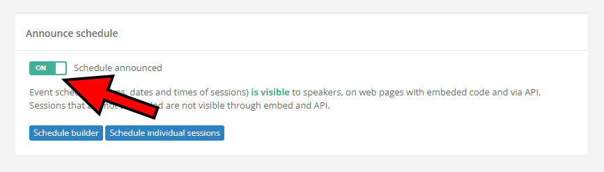 To announce the event's schedule, visit the Announce schedule page and switch the Schedule announced toggle from Off to On. After doing so, your schedule becomes visible to speakers, through the API, and on any web pages that use the appropriate embed code.
