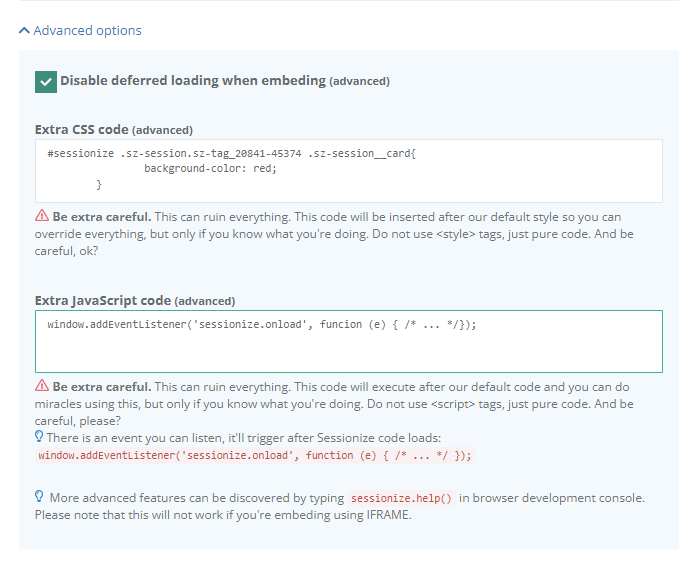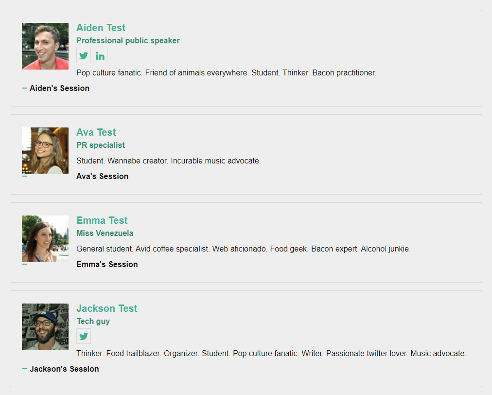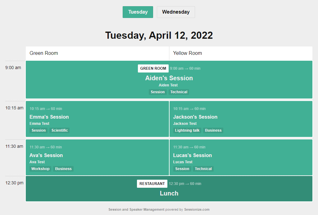 <script type="text/javascript" src="https://sessionize.com/api/v2/6mh71zh8/view/gridsmart"></script>Can I choose my own colors?