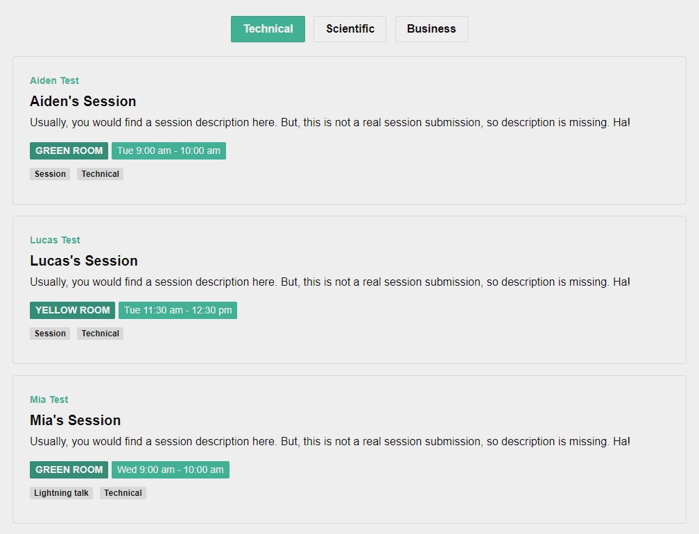 Just click here, and after login, we will create a demo event for you with ten session submissions. You'll be able to use Sessionize in all of its glory, as we don't limit its features even in demo mode. Make sure you accept sessions and inform speakers, and schedule times and rooms for your sessions using Schedule builder.