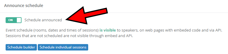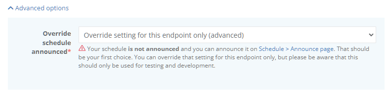 This option can be overridden. In other words, you can allow the schedule to be shown on a certain endpoint without announcing it on an event level. Please note that this should only be used for testing and development purposes.