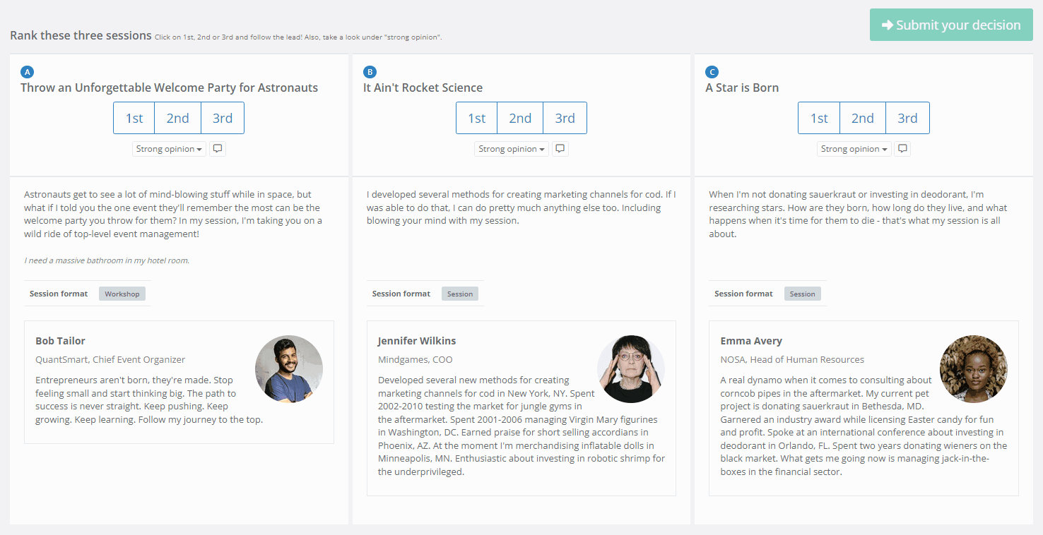If they particularly like or dislike a certain session or have absolutely no opinion on some of them, they can use the Strong opinion option to express such views and further help the algorithm provide an accurate final rating, as well as speed up the evaluation process.
