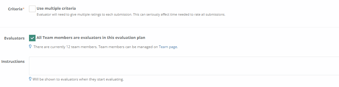 Do consider that adding multiple criteria to your stars rating evaluation plan can heavily affect the time needed to rate all of your submissions. This evaluation mode generally works best for events that don't have a huge number of submissions.