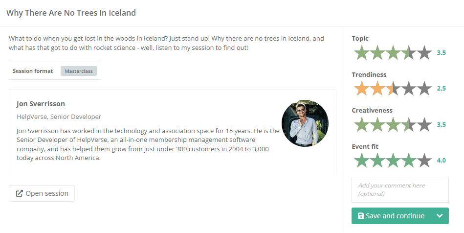 The Stars rating evaluation mode is possibly the most straightforward one. Your evaluators simply have to go through every session and rate it with 1-5 stars. Half-star ratings are also supported. Once they do that, you'll have a clear overview of which sessions have the highest rating and, as such, are the best choice for your event.