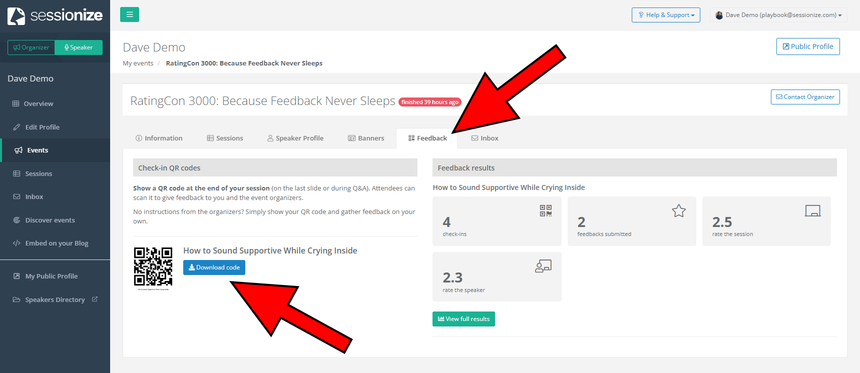 You can access your feedback QR codes and view results in real time through your Speaker Dashboard. Open the event from your Events page and navigate to the Feedback tab. Download your QR code and include it in your presentation - placing it on the final slide works best. Attendees will scan it to rate your session and leave feedback.
