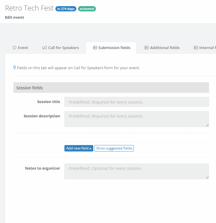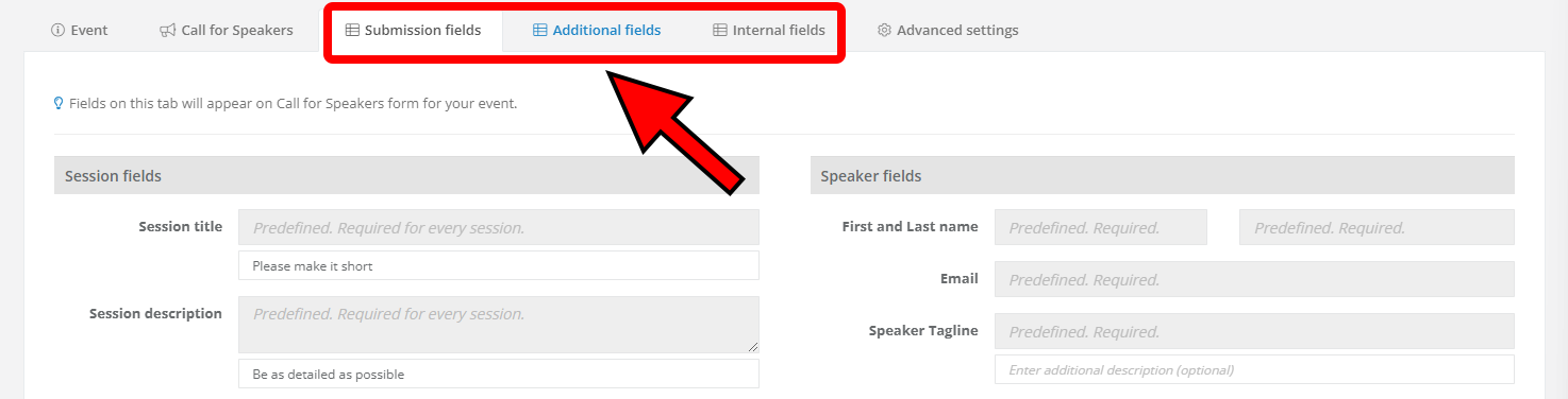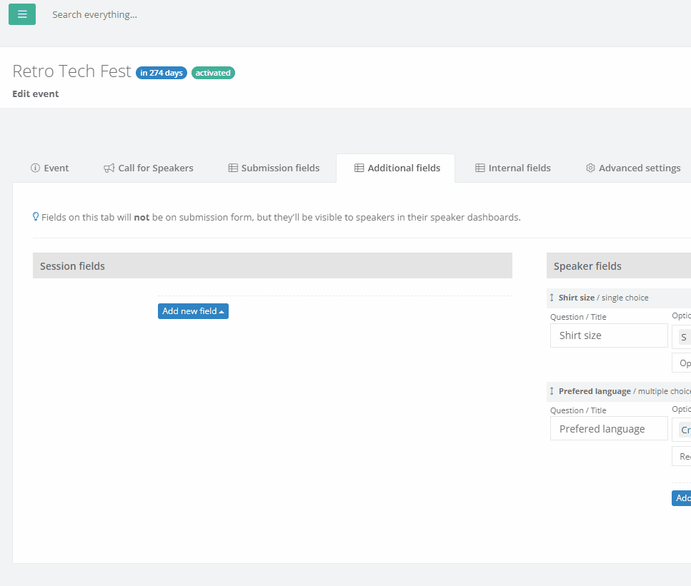 Fields added here aren't visible in the submission form, but they're visible to speakers in their speaker dashboard. Use these additional fields to find out everything you need to know about your speakers and their sessions but isn't appropriate for the Call for Speakers page. For example, you can use the additional fields to find out about their flight number, session's special technical requirements, and so on.
