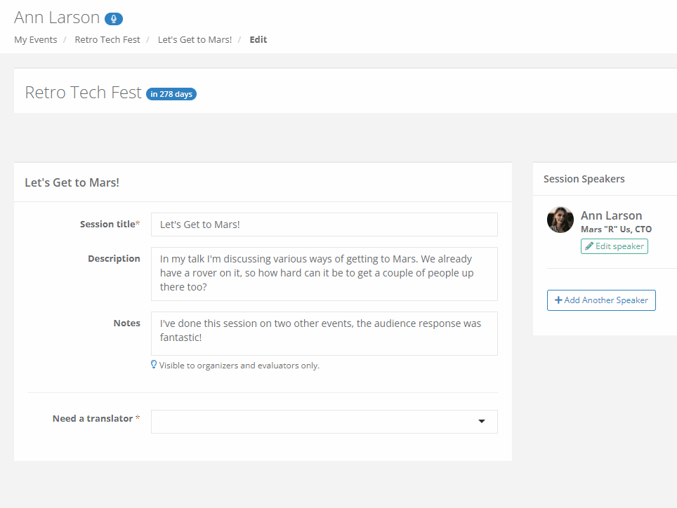 Nobody except yourself and your content team will see the internal fields. Use internal fields to enter session and speaker-related information that you want to keep private, whether it's sensitive or simply irrelevant to the speaker. Clever use of internal fields can greatly help your team handle your event's sessions and speakers.