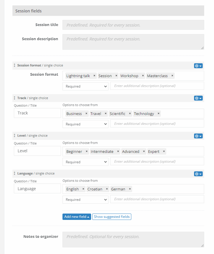 - Session fields - fields containing information related to the sessions being submitted (session format, track, level, language, and similar)