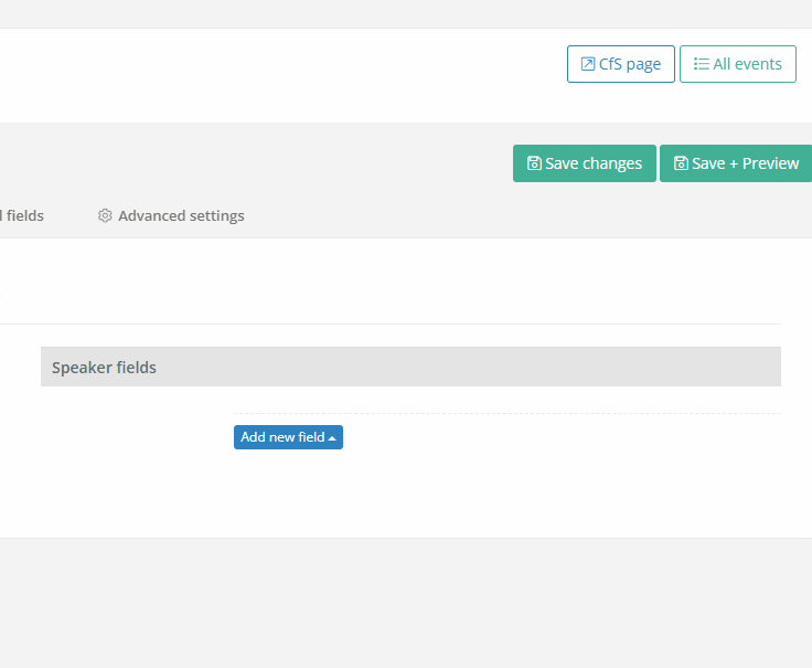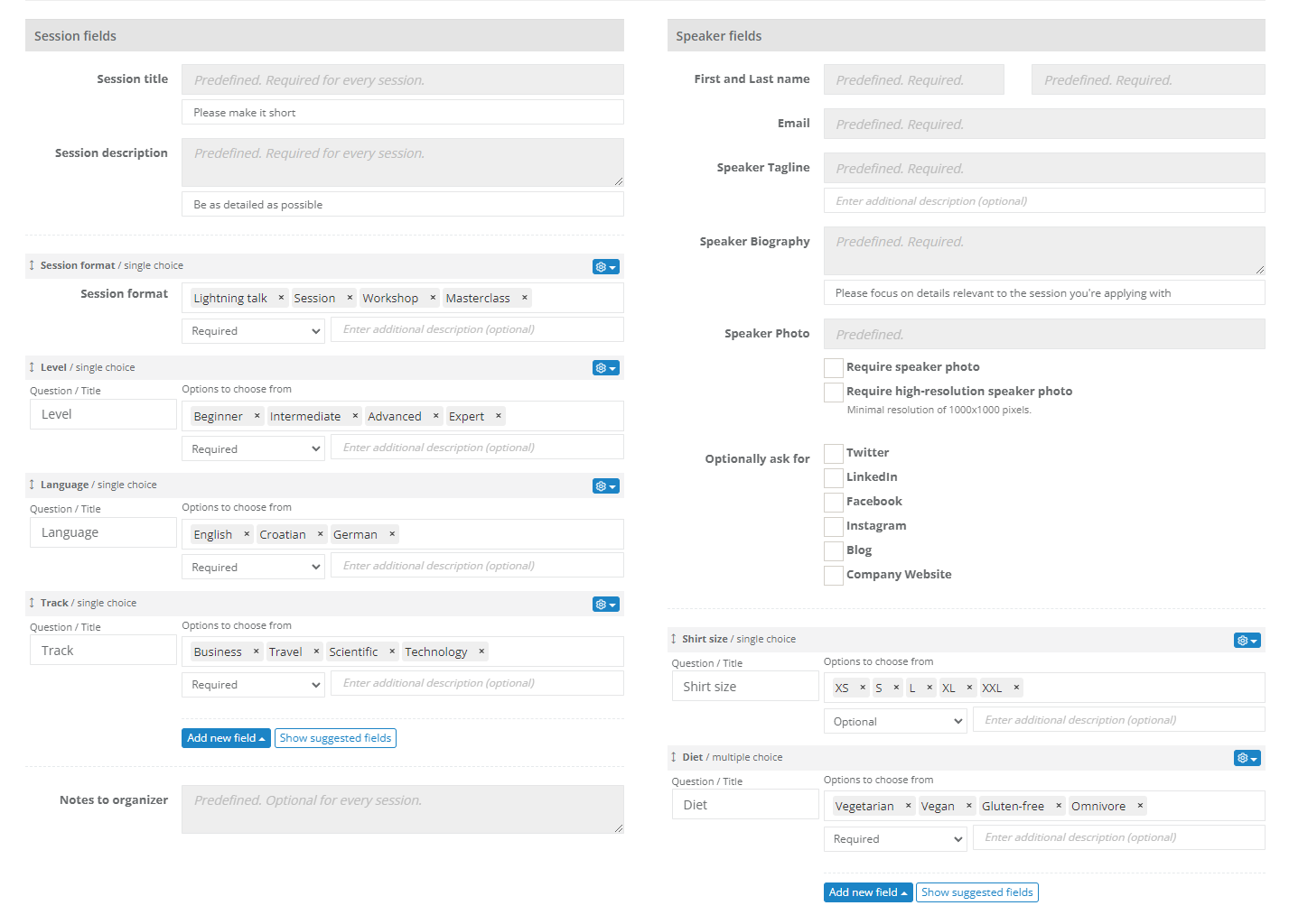 - Speaker fields - fields containing information about the speakers (social network links, shirt size, flight number, demographic categories to ensure diversity and similar)