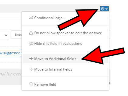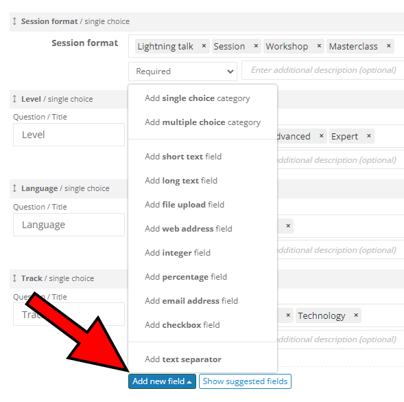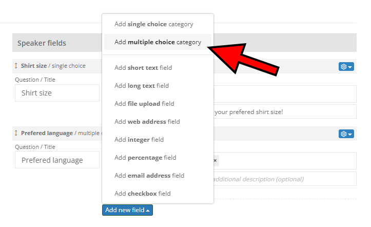 You can easily create single or multiple choice fields with predefined answers. Click Add new field and then select Add single choice category. Enter the question/title and write all of the options you want your speakers to be able to choose from. Click Save changes, and you're done!
