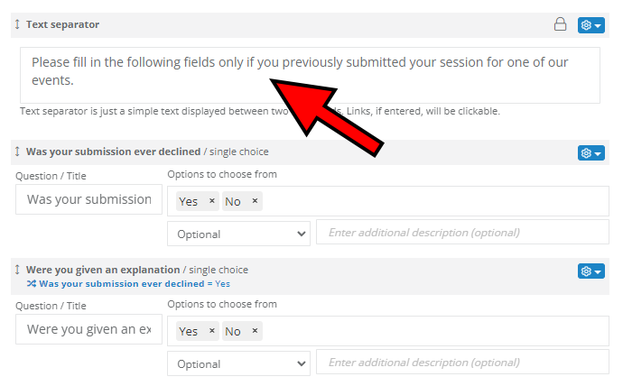 If you want to insert simple text between two fields, you can do so by adding the so-called text separator field. It's just a simple block of text that you can use to provide additional information to submitters in any part of the Call for Speakers form. Links added to text separator fields are going to be clickable.