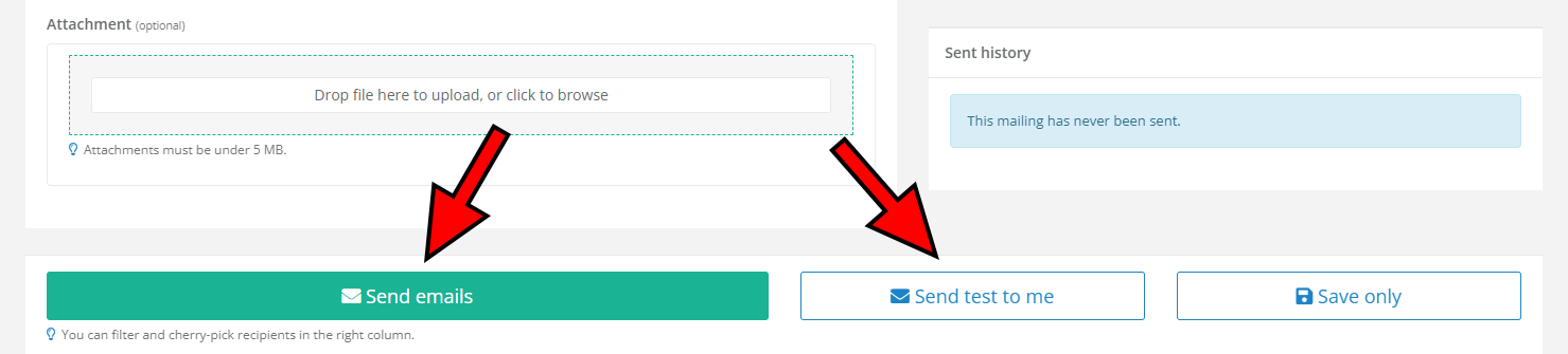 Once done, it's a good idea to send the email to yourself to check if the message looks exactly like you want (Send test to me button). To send the message to the selected recipients, use the Send emails button. You can also save the group message and come back to it later by using the Save only button.