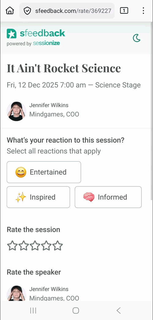 When you’re ready, rate the session and speaker(s) on a 1–5 scale. You can optionally add an emoji reaction that best reflects your experience and leave a comment. In some cases, comments and additional answers may be required, depending on how the organizer configured the feedback form. Once finished, press Submit feedback - and you’re done.