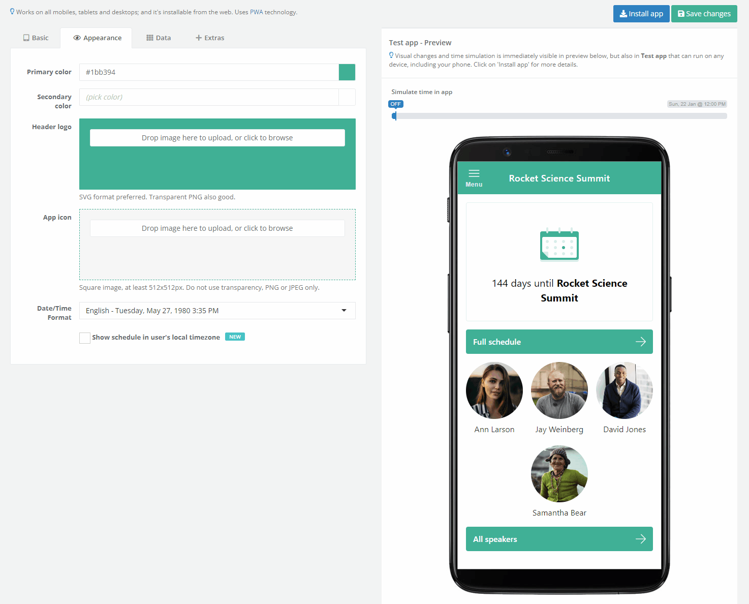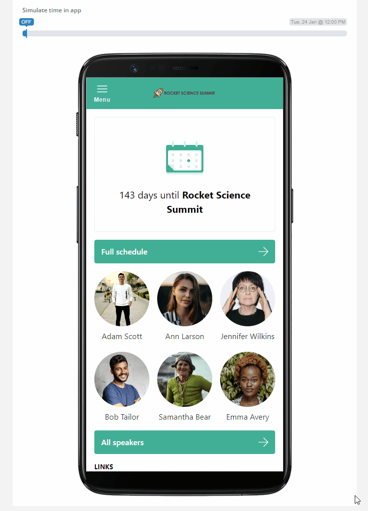 After everything's been adjusted exactly as you wanted, you can use the app preview window to check if you're happy with the results. We also built a timeline simulator that's going to show you what the app is going to look like in the days leading up to your event, during the event, as well as after the event is over. To use it, simply slide across the timeline and stop at the desired day and time. A moment later, the app will update itself to reflect the simulated date and time.