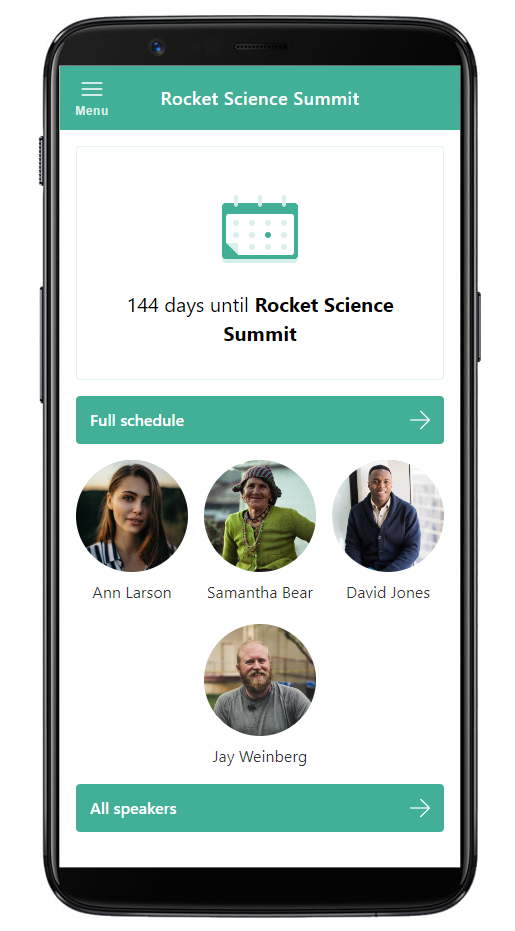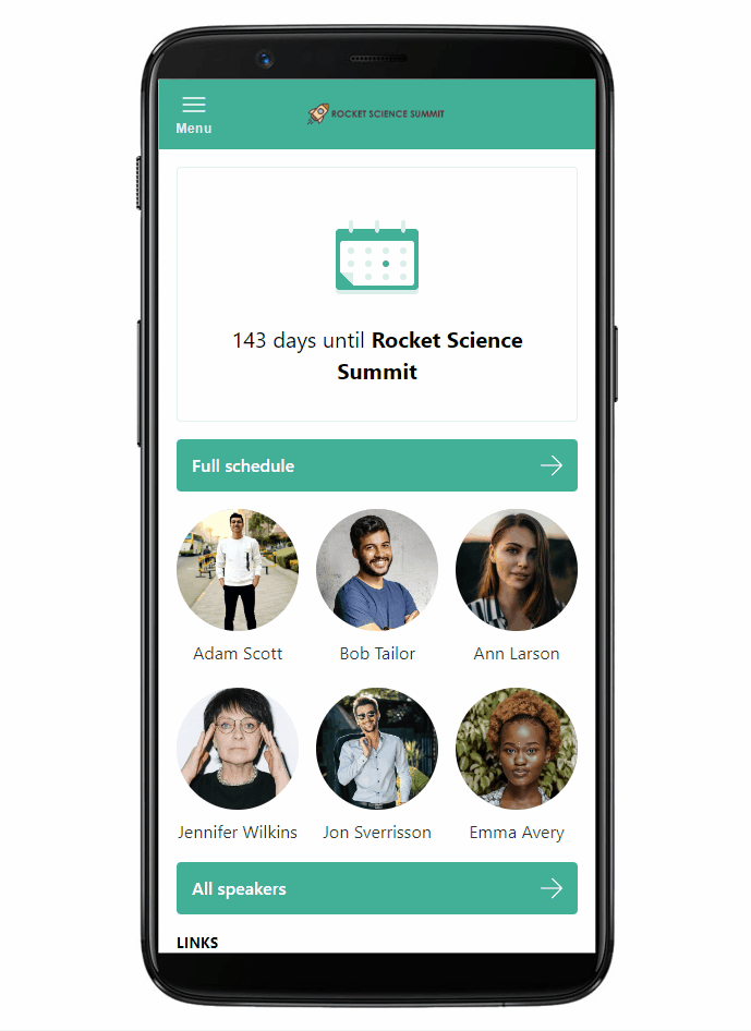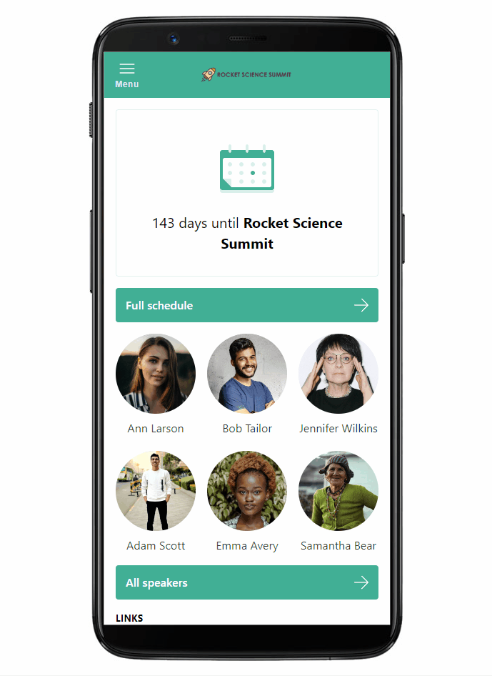 The app is built using Progressive Web App (PWA) technology. Thanks to that, it requires no Google Play Store or Apple App Store certification, and all of your updates are instantly live. Make sure your attendees look for it on the URL you selected for it and not in Google Play Store/Apple App Store.