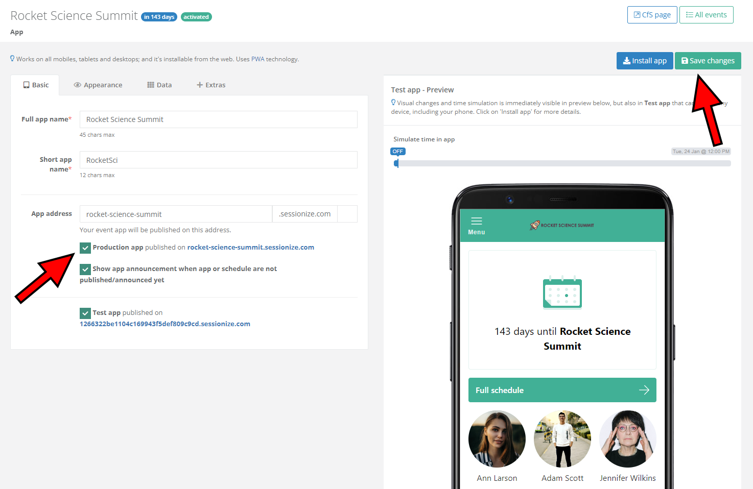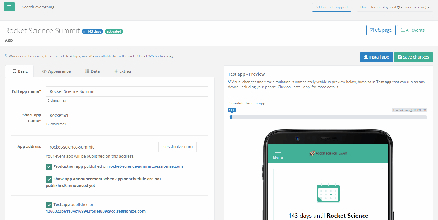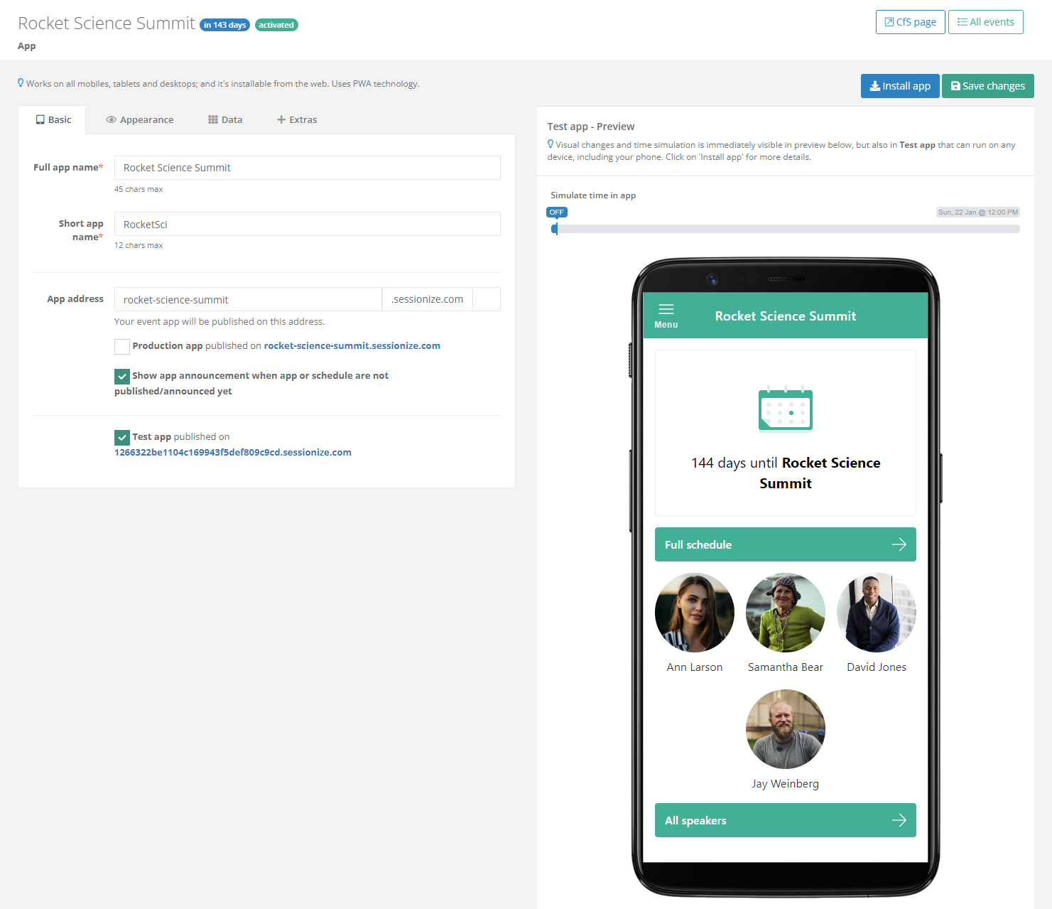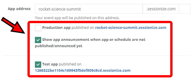 If you want to publish your app for testing purposes, tick the Test app published on… checkbox and click Save changes on top of the page. Sessionize generates a random URL that isn't likely to be guessed by anyone who shouldn't see the app before it has been completed. Look for the test URL below the aforementioned checkbox. You can access it from any mobile or desktop device.