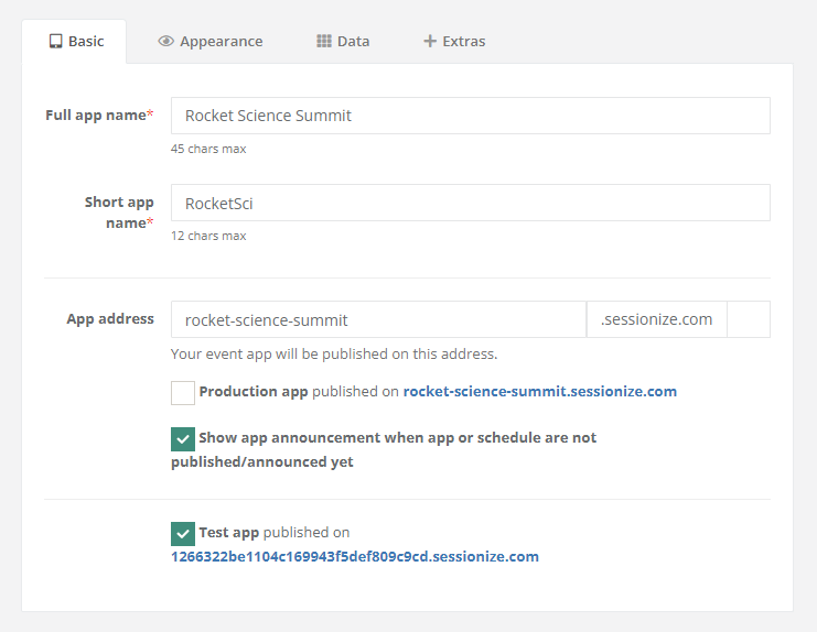 Start by entering the full and short app names in the Basic tab, as well as the web address through which the app will be accessible to your attendees.