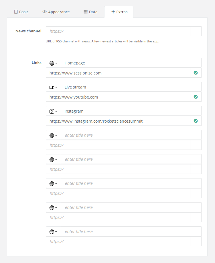 The Extras tab enables you to add an RSS news feed and various URLs to your event's app.
