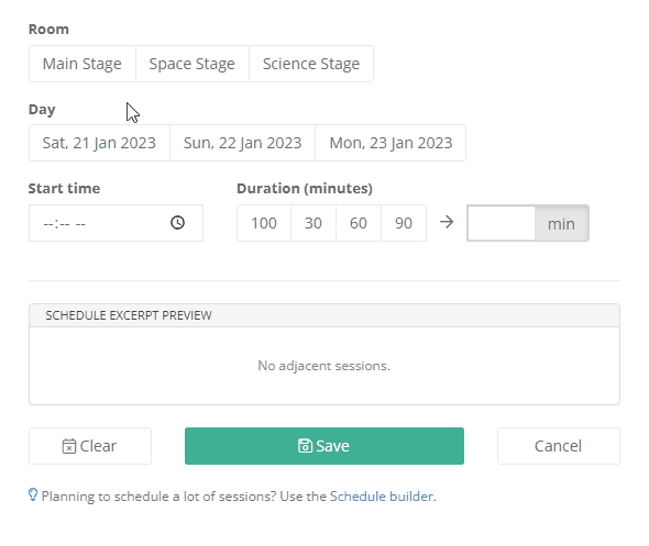 The best way to schedule sessions, especially for events with a larger number of sessions, is to use our Schedule builder.