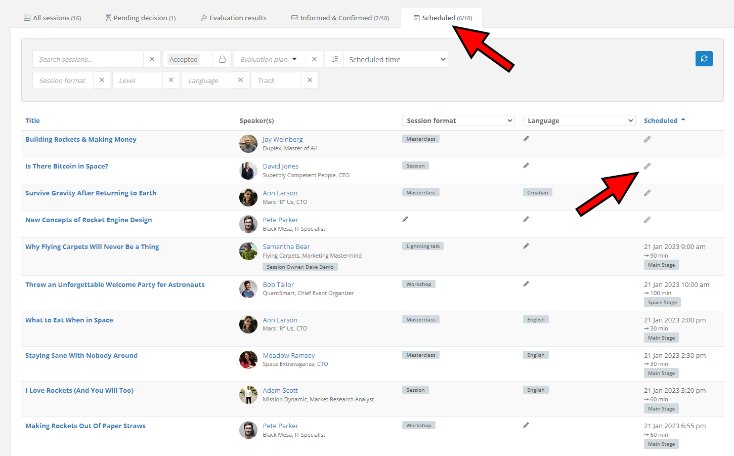 Not seeing a session in the Scheduled tab? Only accepted sessions can be scheduled. Check the session status on the All sessions tab of your event's Sessions page.