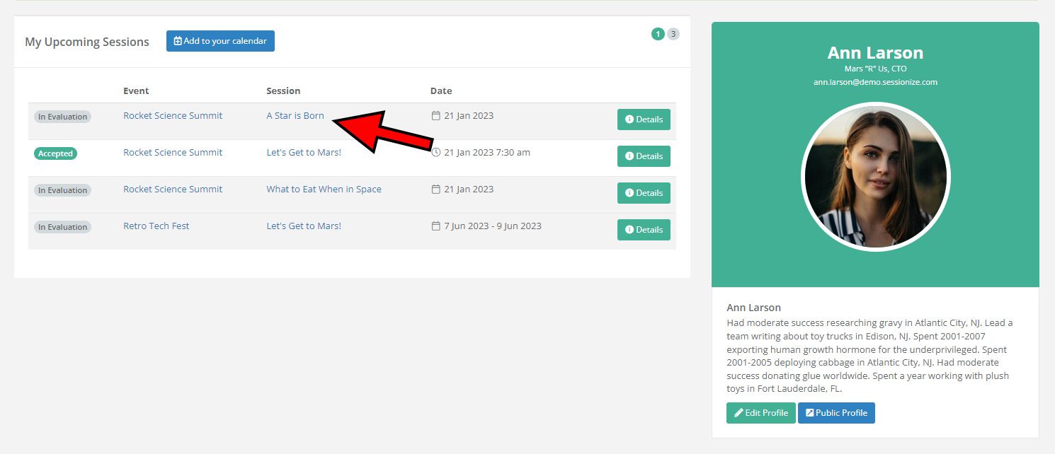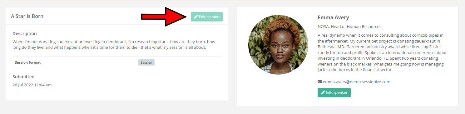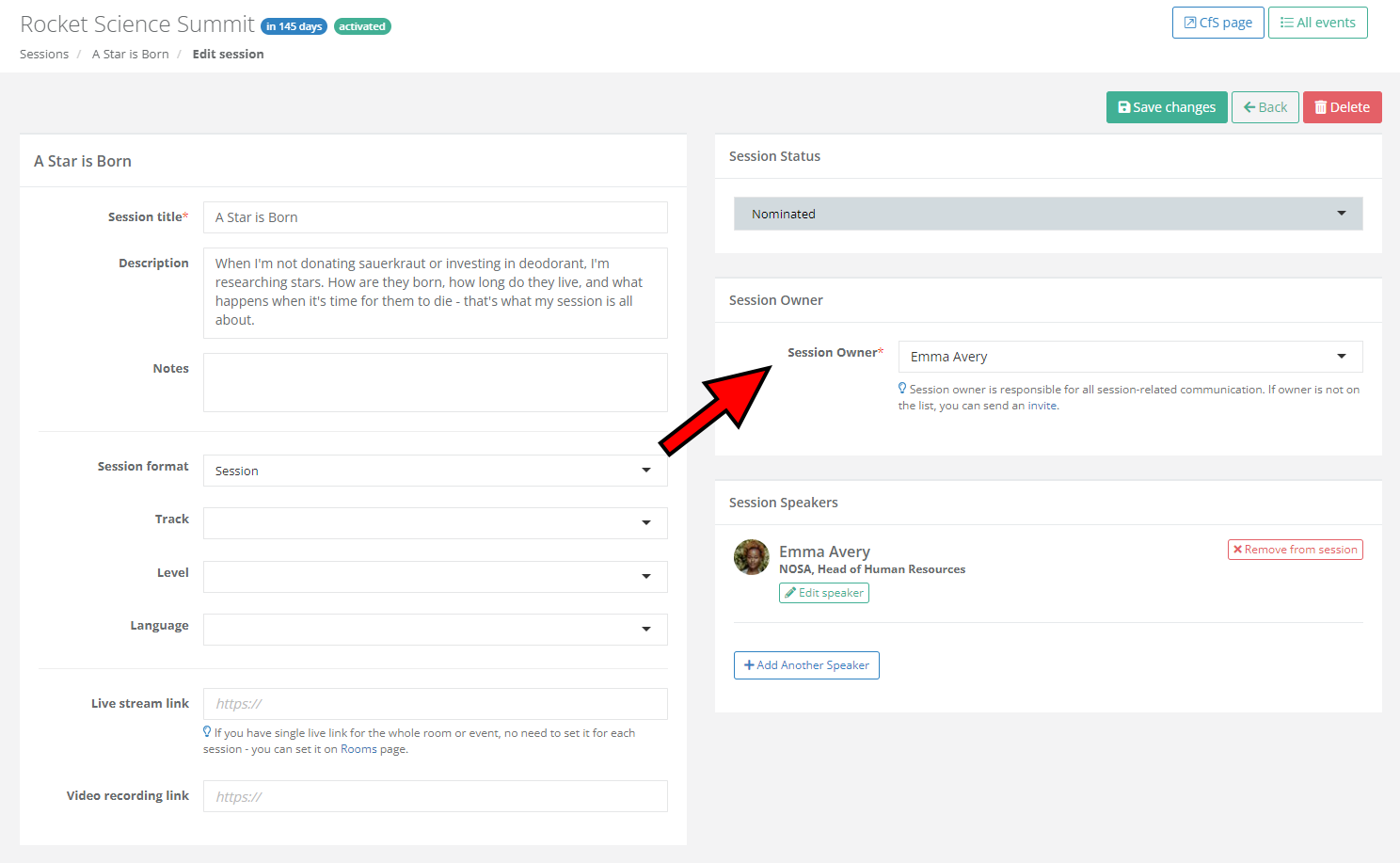 - In case someone else (personal assistant, marketing manager, etc.) submits the session for the speaker, that person becomes the session owner