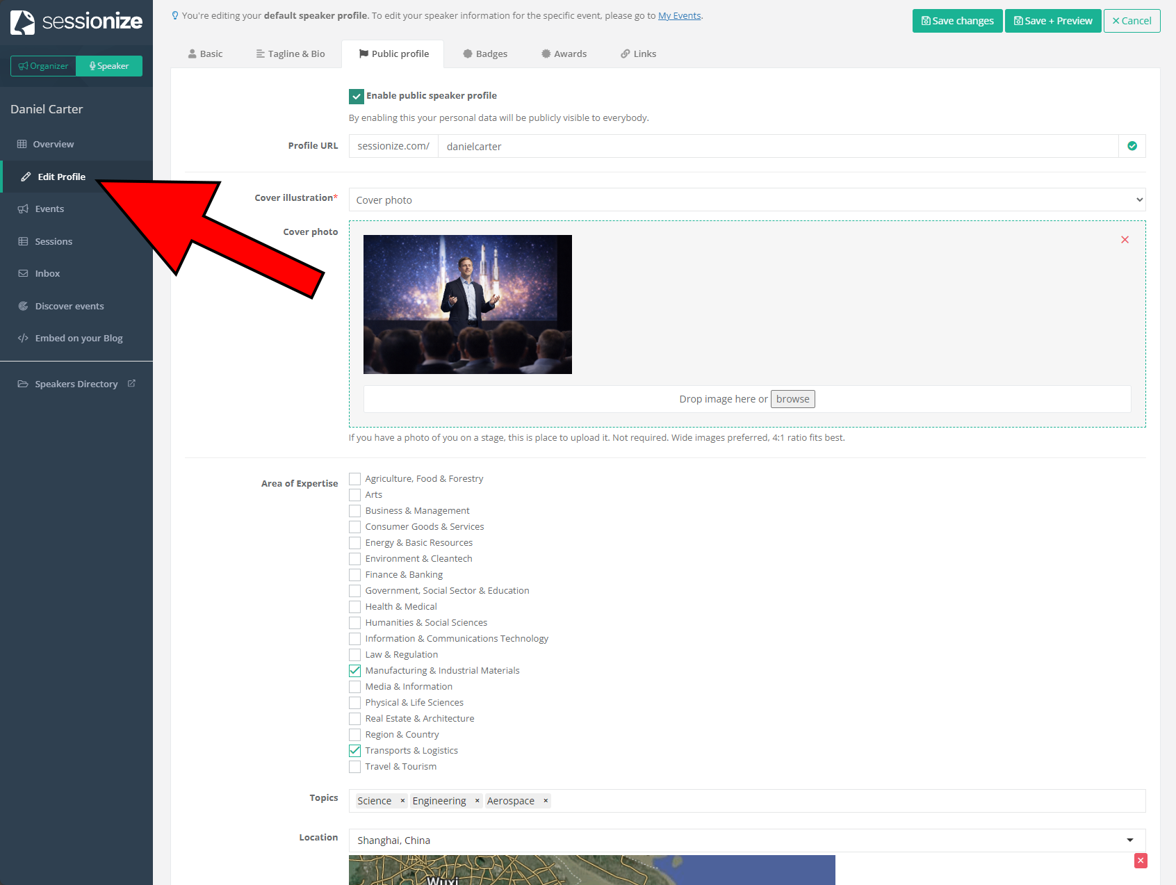 - Public profile — Enable your public speaker profile, set your custom URL, add a cover photo, select your areas of expertise, list specific topics you speak about, and set your location