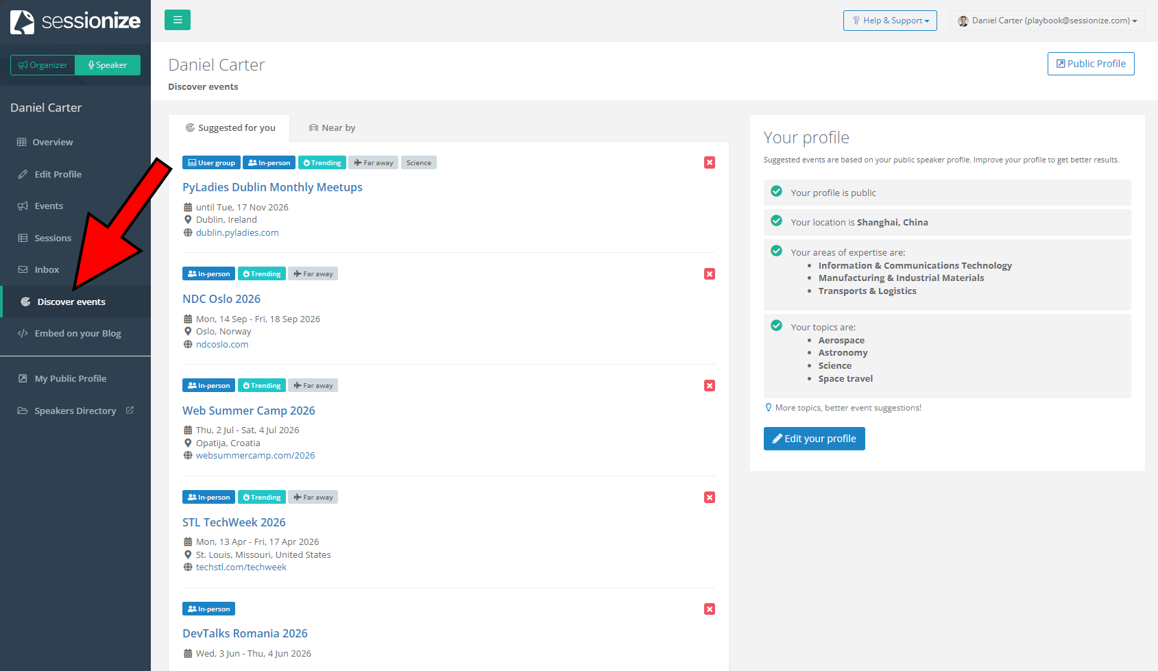 The best way to find speaking opportunities on Sessionize is to complete your public profile thoroughly, check Discover events menu regularly, network and ask for CFP links directly, and be patient. Start by filling in your location, all your areas of expertise, and specific topics you speak about — the more complete your profile, the better your chances of being matched with relevant events. Make it a habit to check Discover events regularly, as new events appear when organizers open their CFPs and choose to make them discoverable. Don't rely solely on Sessionize's discovery feature though - many events share their Sessionize CFP links through their websites, social media, community channels, or speaker networks, and once you have a link, you can submit directly without needing to discover the event through Sessionize. Finally, remember that Discover events is just one channel for finding opportunities, not the only one. Most speakers find events through their own networks, communities, and direct outreach, so keep building those connections alongside using Sessionize.