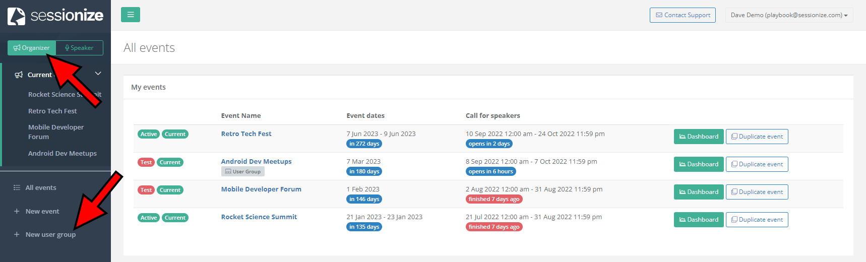 When browsing Sessionize in Organizer mode, look for the New user group option in the menu. Afterward, simply follow on-screen instructions to set up your user group event. If your user group event is free of charge and open to everyone, you're welcome to apply for a community license through the Activate page.