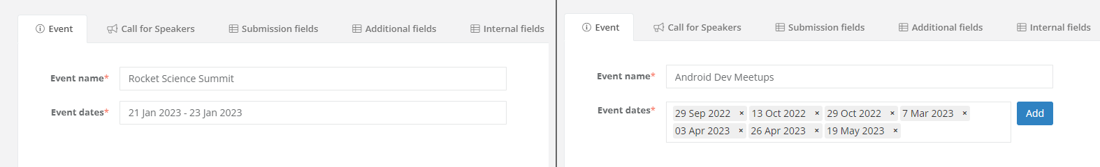 - You can add multiple event dates instead of just one event date/date range (don't need to add all of them in advance; only one date is required, other can be added later)