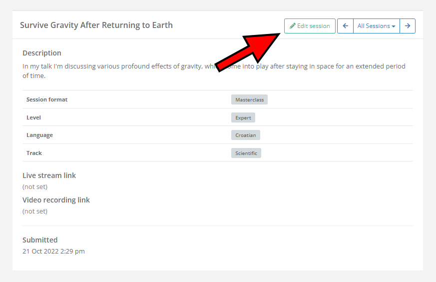 To edit a session, click the Edit session button at the top of the page while viewing it.