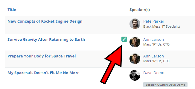 Sessions and speakers can be edited in three ways: