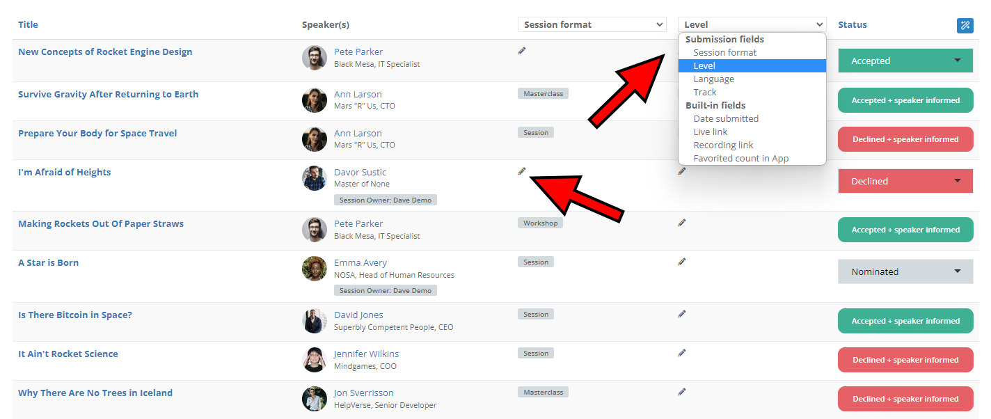 - Bulk edit - an intuitive way of changing data fields for multiple sessions or speakers at once