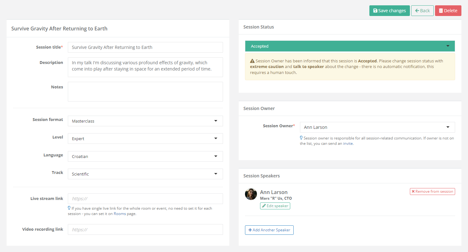 When editing a session, you have the freedom to change anything about it, including its status and owner. You can add or remove speakers and delete the session in its entirety, which is done by using the appropriate button at the top of the page. This is the only way to remove a session from your event.