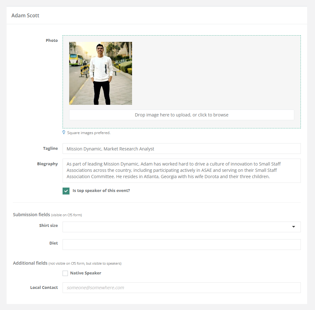 Similarly to sessions, speakers can be viewed or edited. They can be managed on the Speakers page.