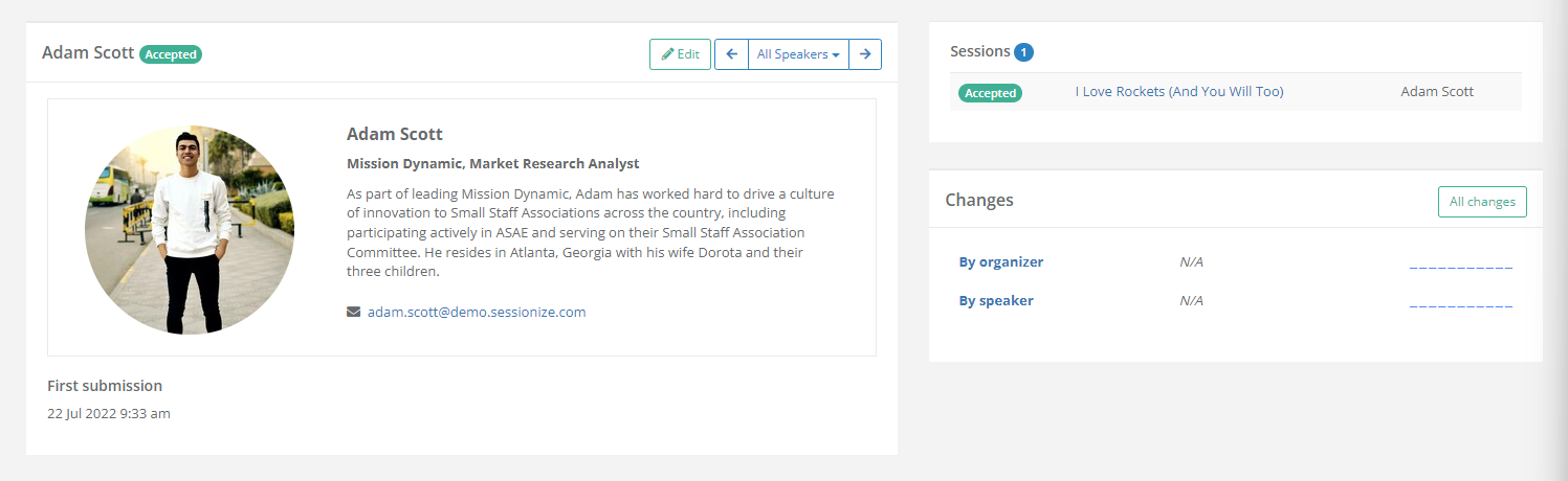 When viewing a speaker, which is done by clicking on their name on the speaker list, you'll get an overview of the speaker, a list of their submitted sessions along with their status, and a history of changes done by yourself or the speaker.