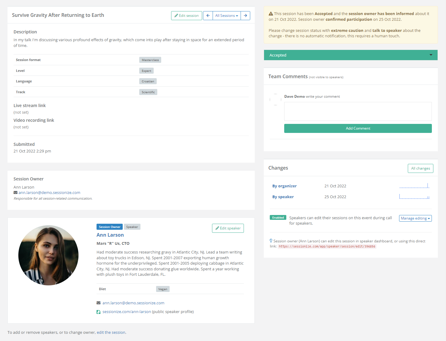 When viewing a session, which is done by clicking on its name on the session list, you'll get an overview of everything related to it, as well as its speaker and owner. You'll also see the comments made by yourself and the members of your team, a history of changes, and so on.