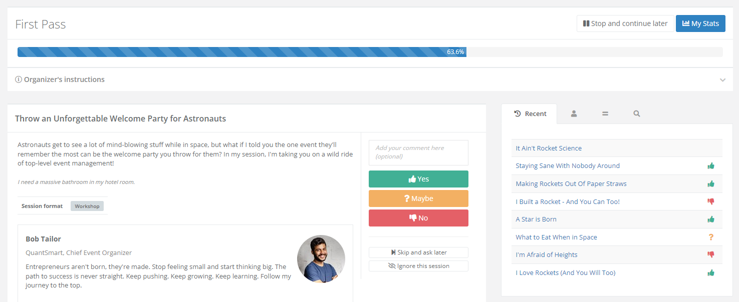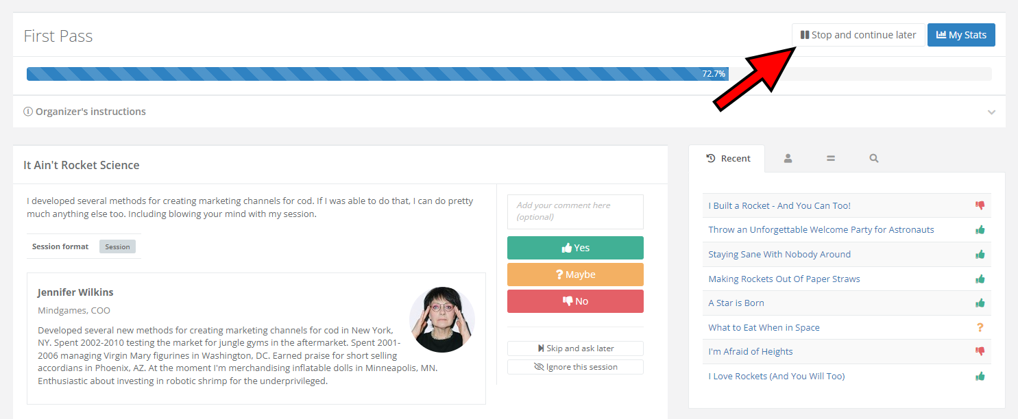 If you have a hard time coming up with a decision about a certain session, you have the option to skip it and come back to it later. Simply click on the Skip and ask later button. This can be particularly useful if you have only just started with the evaluation process and would like to get a better sense of the overall quality of the submitted sessions.