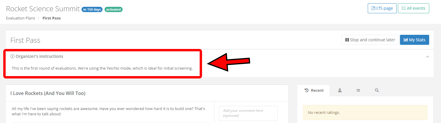 Before you start evaluating the sessions, it is a good idea to check the top of the page, where you'll find the organizer's instructions. Different event organizers can have different expectations from their evaluators, so by checking the instructions, you can be certain that you're in perfect alignment with the organizer.
