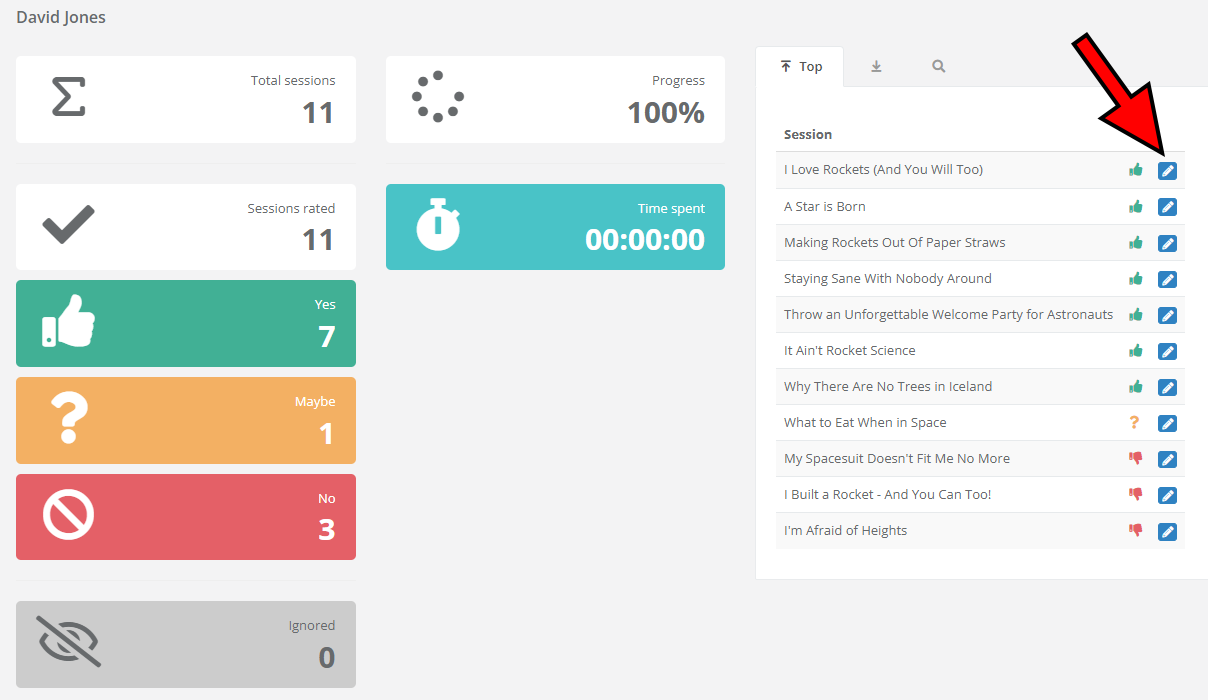 Once you're done with the evaluation, you'll automatically be redirected to the Evaluation page. By opening the evaluation plan you've just completed, you can view your statistics, as well as potentially change your mind on any of the sessions by clicking on the corresponding edit button.